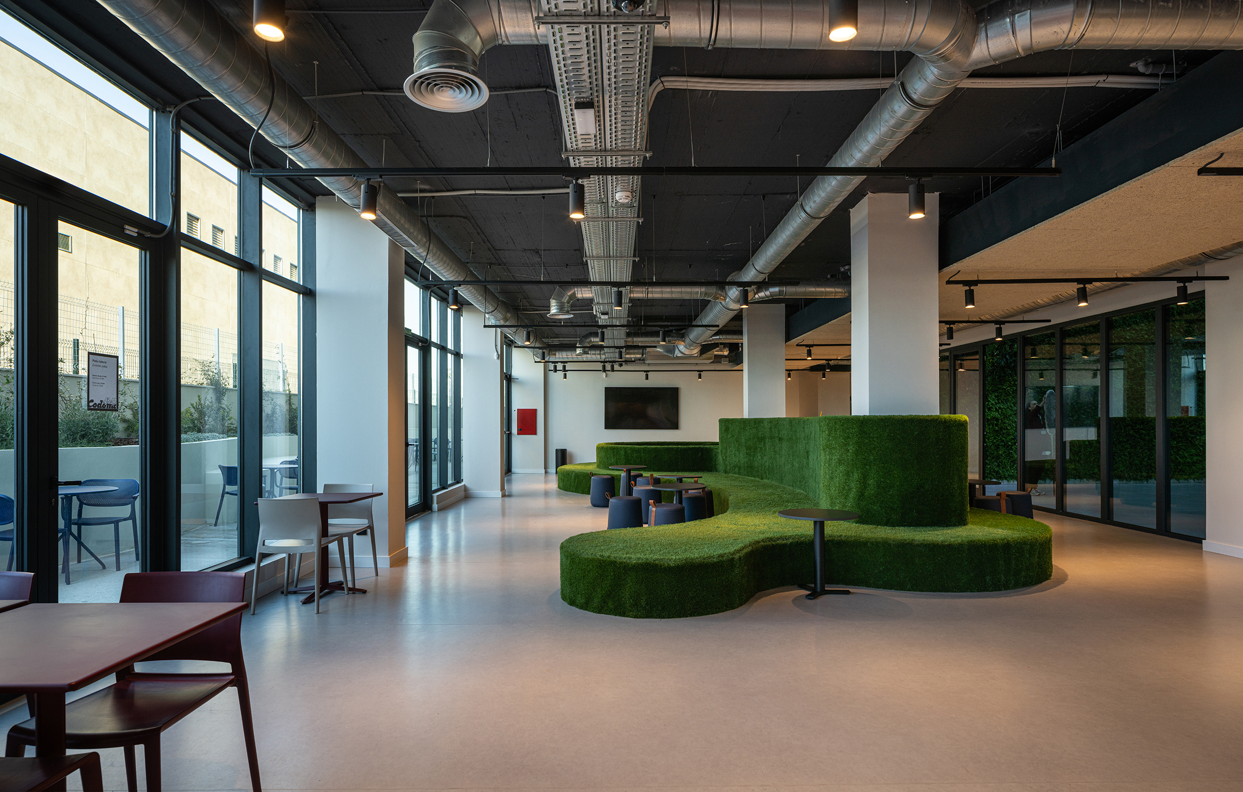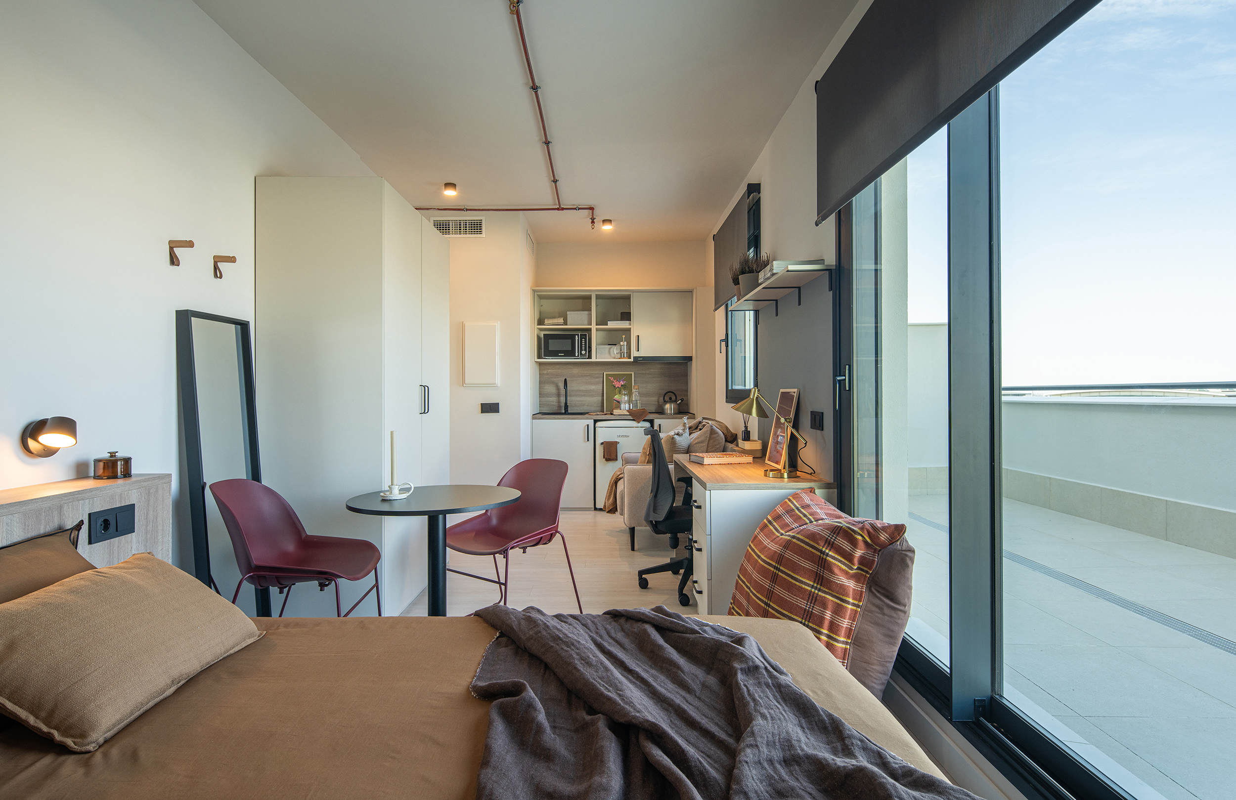 Este proyecto ha dado forma a una nueva residencia de estudiantes pensada para vivirse, no solo para alojarse. Con una volumetría de PB+4+ático, el edificio se diseñó para ofrecer un entorno cómodo, luminoso y conectado con la vida universitaria de Granada. El acceso desde la Avenida del Conocimiento se resolvió de manera amable, combinando escaleras y rampas hasta un semisótano que se elevó 1,50 metros para cumplir normativa y convertirse en el corazón social de la residencia. Allí se habilitaron zonas comunes y de servicios —cantina, espacios de estudio, lavandería, coworking y áreas polivalentes— además de la administración, favoreciendo la convivencia y el día a día. Dos patios interiores aportaron luz y ventilación a todo el conjunto y generaron pequeños espacios verdes, mientras que en la fachada suroeste se creó un área exterior de esparcimiento que conecta interior y exterior. La movilidad se completó con un acceso rodado por el lado norte hacia semisótano y sótano, donde se concentraron el aparcamiento y las instalaciones: 102 plazas, 12 adaptadas. La residencia se finalizó con 357 unidades de alojamiento individuales —12 accesibles—, equipadas con baño completo, zona de descanso, almacenaje y kitchenette. En el ático se dispusieron zonas comunes y terraza, y en la salida a cubierta se reservó un espacio de huerto para los residentes. Todo ello articulado con dos núcleos de escaleras y tres ascensores para un funcionamiento cómodo y accesible.